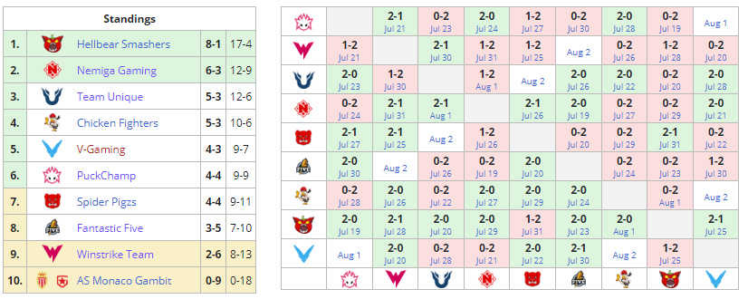 Hellbear Smashers по-прежнему занимает первое место (8-1). Команда сыграла все матчи, сохраняя лидерство. Состав Chicken Fighters остается на четвертой строчке (5-3). Завтра коллектив встретится с V-Gaming.