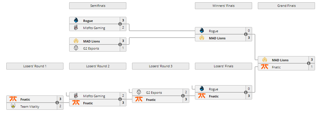 Состав киберспортивного клуба MAD Lions в финале LEC Summer 2021 со счетом 3:1 обыграл Fnatic и стал чемпионом ивента. Тройка лучших команд турнира заработала путевки на 2021 World Championship с призовым фондом $2 225 000.