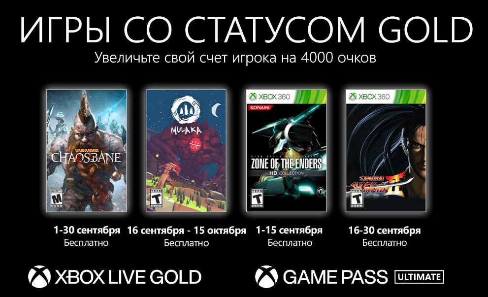 Владельцы золотого уровня подписки получат доступ к экшен-RPG Warhammer: Chaosbane (1-30 сентября) и экшену о роботах от студии Konami под названием Zone of the Enders 3D Collection (1-15 сентября). Кроме того, пользователи смогут поиграть в файтинг Samurai Shodown II (16-30 сентября) и игру о мифах народов Мексики Mulaka (16 сентября — 15 октября).