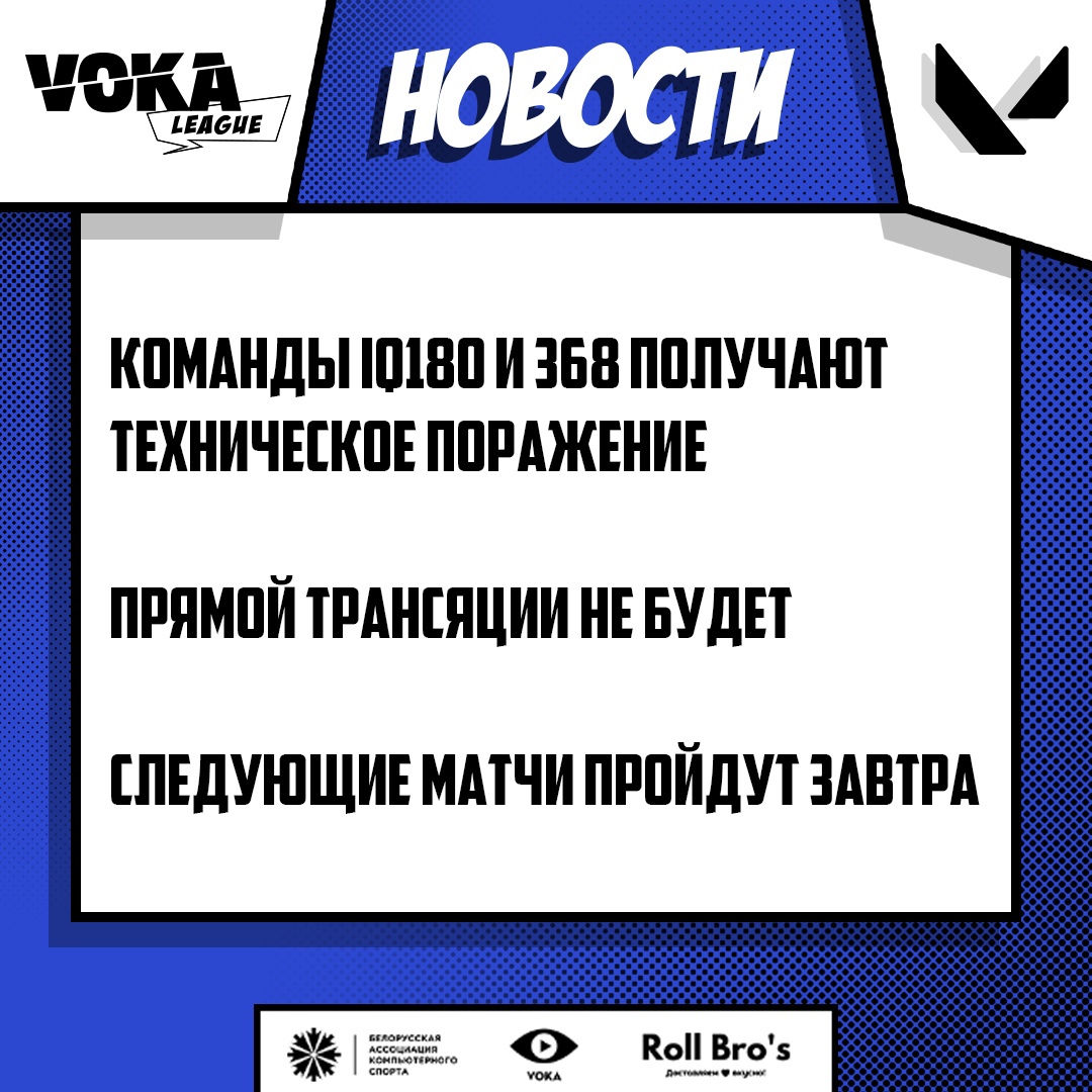 Сегодня, 28 августа, должны были пройти два мачта в рамках групповой стадии VOKA League Season 4 по Valorant. Однако команды IQ180 и 368 получили технические поражения и потеряли шанс выйти в плей-офф турнира. Запланированный эфир был отменен. Об этом сообщил турнирный организатор на своей официальной странице во ВКонтанкте.