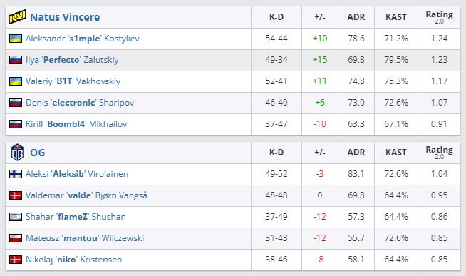 В стартовом матче группы “C” BLAST Premier: Fall Groups 2021 NaVi переиграли OG со счетом 2:1 (Overpass — 16:4, Dust2 00 13:16, Mirage — 16:8). “Рожденные побеждать” продолжат выступление на турнире в верхней сетке, а западноевропейский коллектив ждет игра на выбывание в нижней.