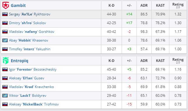 В матче группы “D” четырнадцатого сезона ESL Pro League Gambit Esports оказалась сильнее Entropiq. Счет — 2:0 (Dust2 — 16:13, Vertigo — 16:10). Победители после четвертого успеха на турнире гарантировали себе место в плей-офф. А вот проигравшие шансы на выход из группы утратили, их статистка 1-3.