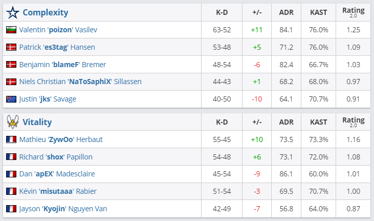 В матче плей-офф четырнадцатого сезона ESL Pro League Complexity со счетом 1:2 проиграла Team Vitality и покинула турнир. Следующий соперник “пчел” — Gambit Esports, встреча состоится 10 сентября в 20.15.