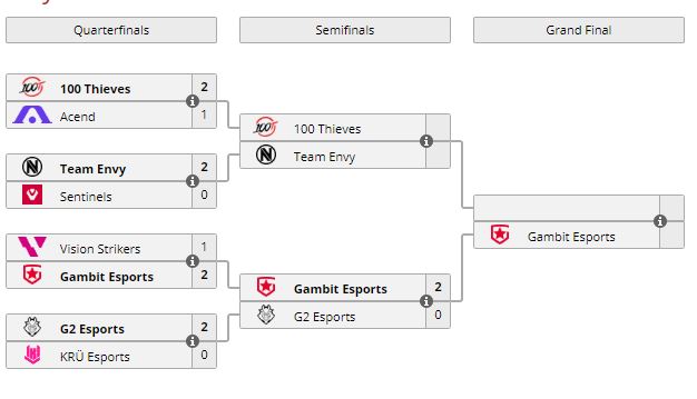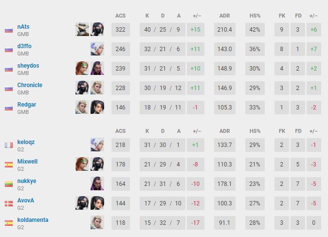 Gambit вышла в финал VALORANT Masters Berlin. Команда из СНГ нанесла поражение G2 — 2:0 (Breeze — 13:10, Icebox — 13:0). Проигравшие заработали за 3-4 место $85 000. Решающий поединок турнира состоится 19 сентября (19.00). Соперником Gambit станет победитель пары 100 Thieves — Team Envy.
