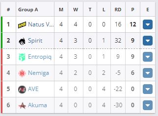По итогам четвертого раунда безоговорочным лидером группы “А” являются Natus Vincere, пока не знавшие поражений (4-0). Вторую строчку делят Entropiq и Team Spirit (2-1). Nemiga Gaming после двух побед подряд (2-2) занимает четвертое место. Замыкают таблицу Akuma и Ave (0-4).