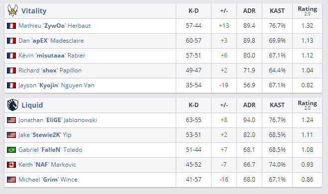 На Inferno, которую “лошадки” пикнули, Vitality просто разгромила оппонентов — 16:6. На Vertigo, которую выбрал французский коллектив, в два раза сильнее была Liquid — 16:8. Таким образом, команды выиграли чужие пики. На решающей Mirage первую половину вела Vitality — 10:5, затем американская команда смогла закамбэчить, но победить все равно не удалось — 16:11. Итоговый счет — 2:1.