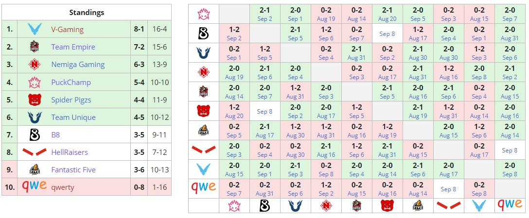Отечественный коллектив занял третью строчку в турнирной таблице при шести победах и трех поражениях. V-Gaming заняла первое место в групповом этапе со счетом 8-1. Соперники команд по стадии плей-офф станут известны после завершения всех матчей группового этапа.