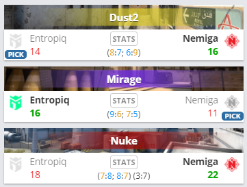 В рамках групповой стадии Funspark ULTI 2021: Europe Season 3 Nemiga Gaming со счетом 2:1 обыграла Entropiq. На первой карте (Dust2) была сильнее белорусская команда — 16:14, на второй (Mirage) российская — 16:11, а третья (Nuke) завершилась дополнительными раундами и победой “Немиги” — 22:18.