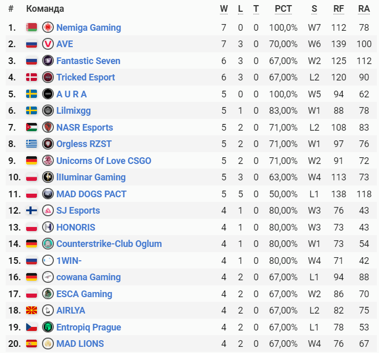 Топ-20 команд регулярного сезона ESEA Season 38: Advanced Division – Europe на текущий момент: