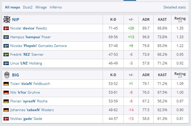 Ninjas in Pyjamas в гранд-финале группы “B” BLAST Premier: Fall Groups 2021 оказались сильнее BIG. Счет — 2:1 (Dust2 — 14:16, Mirage — 16:13, Inferno — 16:5). Победителям группы досталось $25 000 призовых. Второе место принесло BIG $12 500. При этом оба коллектива-финалиста гарантировали себе участие в следующей стадии турнира — Fall Finals.