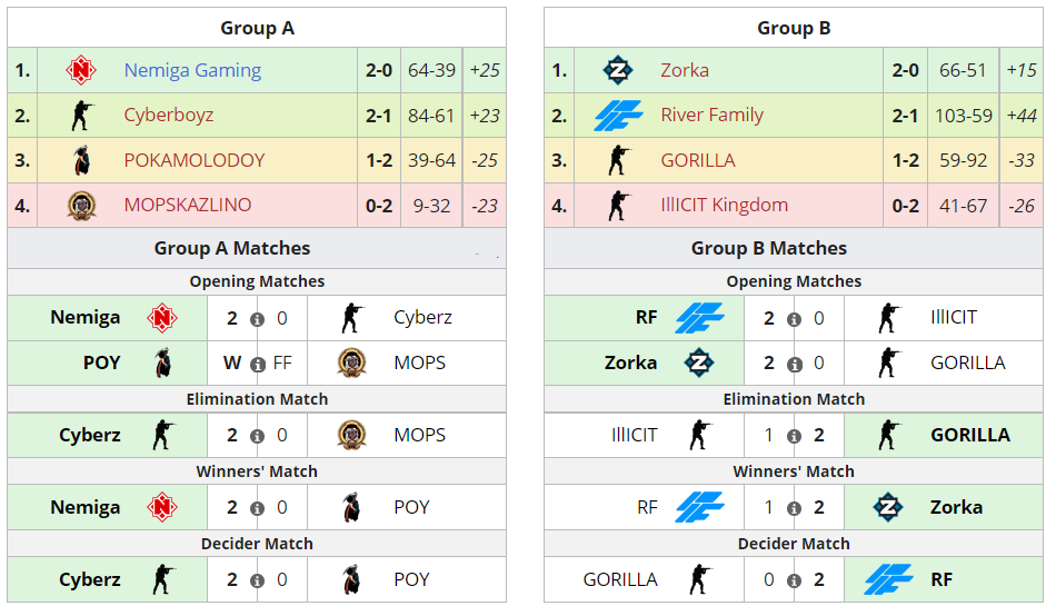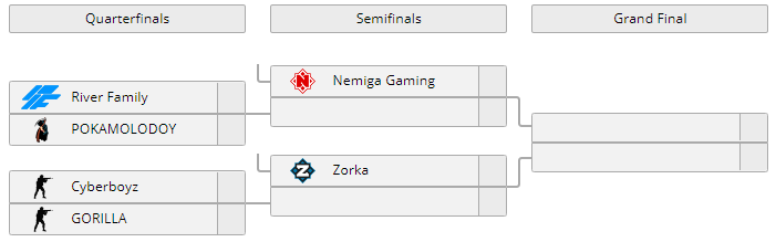 В плей-офф турнира прошли Nemiga Gaming, Zorka, Cyberboyz, River Family, POKAMOLODOY и CyberBoyz. Эти коллективы определят сильнейшего 25 и 26 сентября в минской META Arena.
