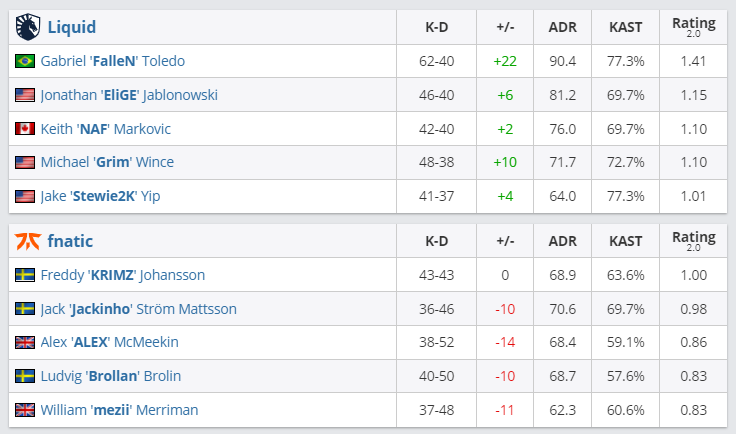 В матче плей-офф четырнадцатого сезона ESL Pro League Fnatic со счетом 0:2 уступила Team Liquid и покинула соревнования, заработав $25 000. Первая карта (Nuke) завершилась со счетом 16:4, вторая (Dust2) — 25:21. В четвертьфинале турнира “жидкие” встретятся с датской командой Heroic, встреча состоится 10 сентября в 20.15.