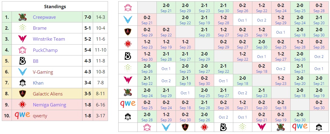 21.00. Galactic Aliens — Creepwave. За Galactic Aliens играет белорус Сергей HappyDyurara Хоронжий. Цвета Creepwave защищает Дмитрий Fishman Полищук.