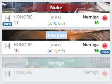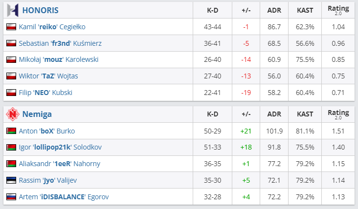 В финале нижней сетки плей-офф ESEA Season 38: Advanced Division — Europe Nemiga Gaming со счетом 2:0 (Nuke – 16:11, Overpass – 16:10) обыграла польский коллектив HONORIS.