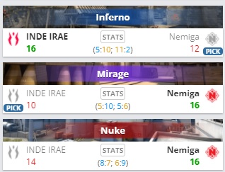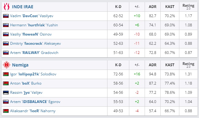 Во втором раунде главного группового этапа Pinnacle Fall Series #2 Nemiga Gaming со счетом 2:1 (Inferno — 12:16, Mirage — 16:10, Nuke — 16:14) обыграла коллектив Inde Irae.