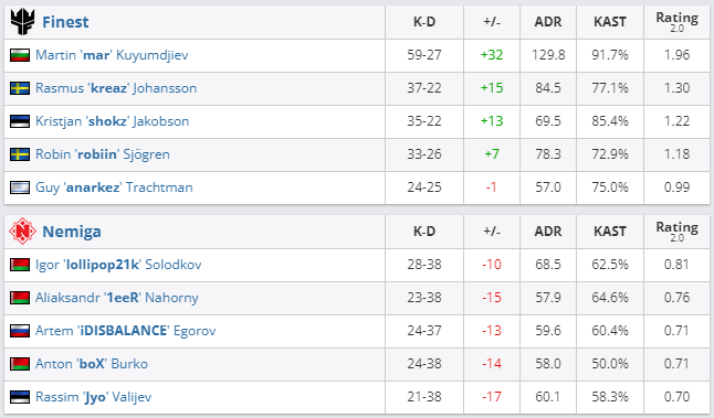 В гранд-финале нижней сетки плей-офф ESEA Season 38: Advanced Division — Europe Nemiga Gaming со счетом 0:3 (Inferno – 7:16, Overpass – 9:16) уступила Team Finest (у коллектива было стартовое преимущество в одну карту, как у финалиста верхней сетки).