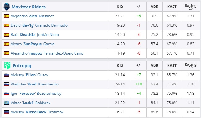 Состоялись еще два матча третьего раунда стадии претендентов PGL Major Stockholm 2021 по CS:GO. Российский состав Entropiq обыграл Movistar Riders — 16:12 (Mirage, 9:6; 7:6). В параллельном поединке ENCE была сильнее MOUZ — 16:11 (Nuke, 9:6; 7:5). Оба матча прошли на карте Nuke. Победившие команды заработали себе счет 2:1, а проигравшие оказались в одной карте от вылета с турнира.