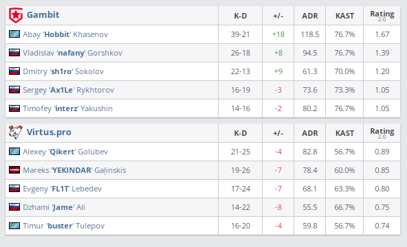 В параллельном матче на карте Vertigo играли Gambit и Virtus.Pro. “Медведи” потеряли концентрацию в решающих раундах и со счета 14-11 в свою пользу проиграли матч — 14-16 (7:8; 7:8).