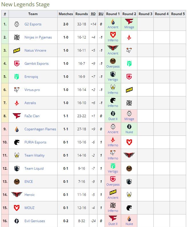 В матче второго раунда стадии “Легенд” PGL Major Stockholm G2 оказалась сильнее FaZe Clan на Mirage (16:7) и еще на шаг приблизилась к плей-офф. На счету представителей Франции теперь две победы. В параллельном матче Evil Geniuses потерпели второе поредение в “Легендах”. Их обидчиком стали парни из Copenhagen Flames — 2:16 на карте Nuke.