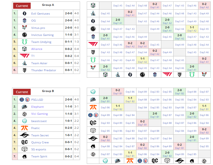 Групповой этап TI продлится до 10 октября. По его итогам две команды (худшая в каждой группе) покинут турнир. По четыре лучших коллектива из каждой группы получат путевки в верхнюю сетку плей-офф. Остальные попадут в нижнюю.