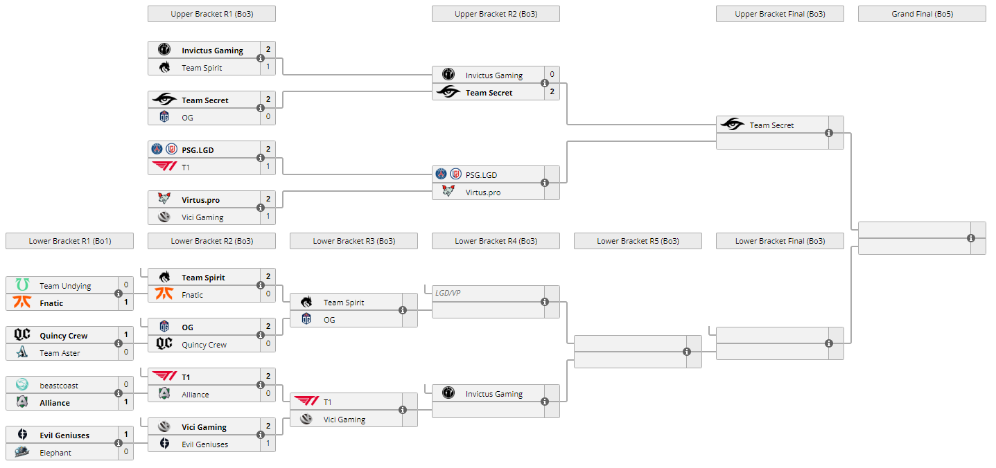 В плей-офф The International 10 Team Secret со счетом 2:0 обыграла Invictus Gaming и вышла в финал верхней сетки. Следующий соперник команды Клемента Puppey Иванова определится в противостоянии PSG.LGD и Virtus.pro. А китайская команда в нижней сетке сыграет с сильнейшем пары T1 и Vici Gaming.