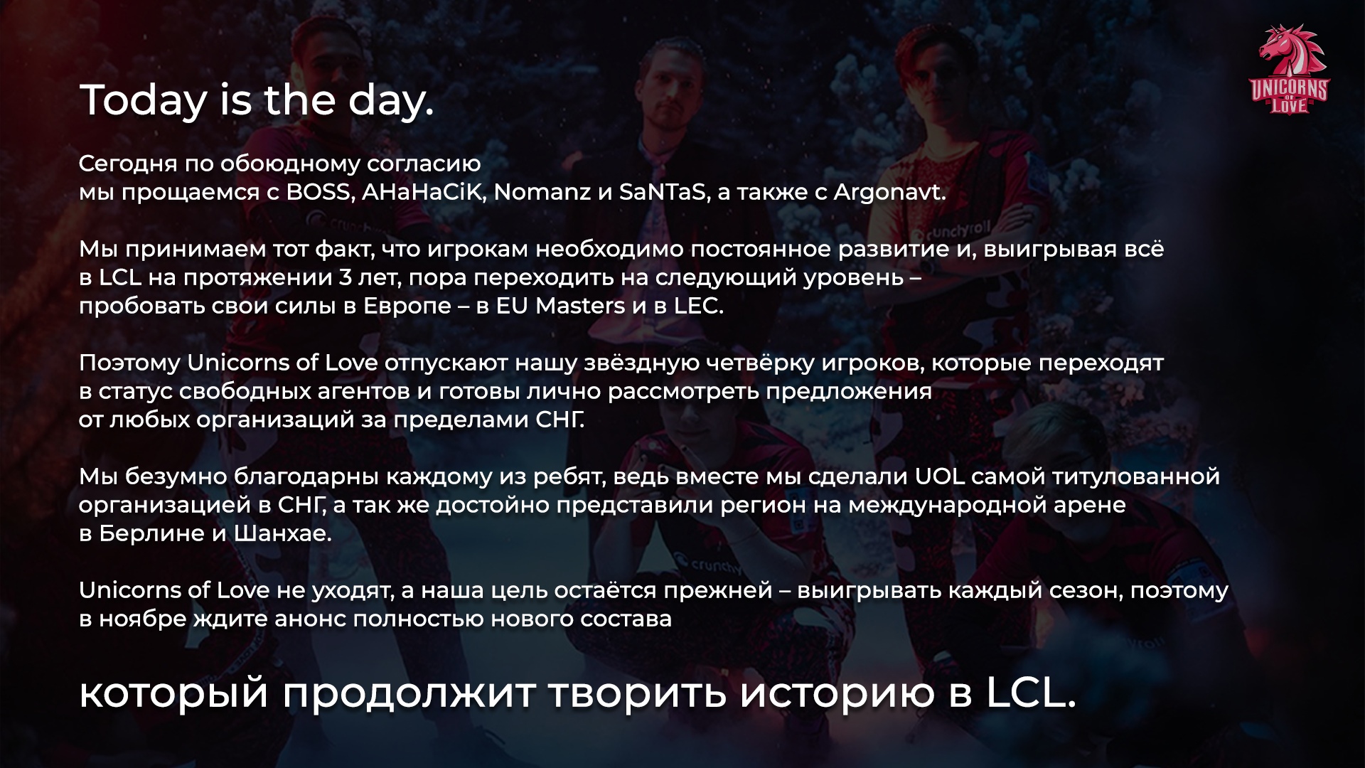 Европейская киберспортивная организация Unicorns of Love распустила ростер по League of Legends. Об этом клуб сообщил в официальной группе во ВКонтакте. Состав распался по обоюдному согласию игроков и организации.