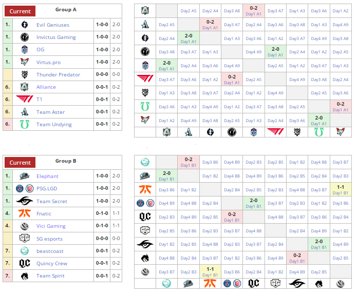 Групповой этап TI продлится до 10 октября. По его итогам две команды (худшая в каждой группе) покинут турнир. По четыре лучших коллектива из каждой группы получат путевки в верхнюю сетку плей-офф. Остальные попадут в нижнюю.