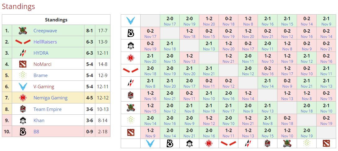 В матче группового этапа Dota 2 Champions League Season 5 Team Empire расправилась с B8 — 2:0. Таким образом команда Dendi проиграла во всех девяти встречах турнира и заняла последнее место. “Имперцы” же добились трех побед при шести поражения. Теперь российской команде предстоит принять участие в тай-брейке с Khan за восьмое место и право попасть в нижнюю сетку плей-офф. Матч запланирован на 22 ноября (20.00).