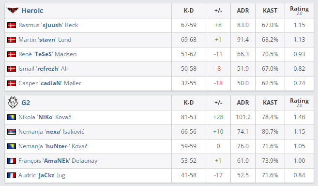 Завершился первый полуфинальный матч PGL Major Stockholm 2021. Датская Heroic проиграла G2. Счет — 2:1 (Nuke — 8:7; 8:5, Mirage — 8:7; 2:9, Inferno — 6:9; 9:6;0:4).