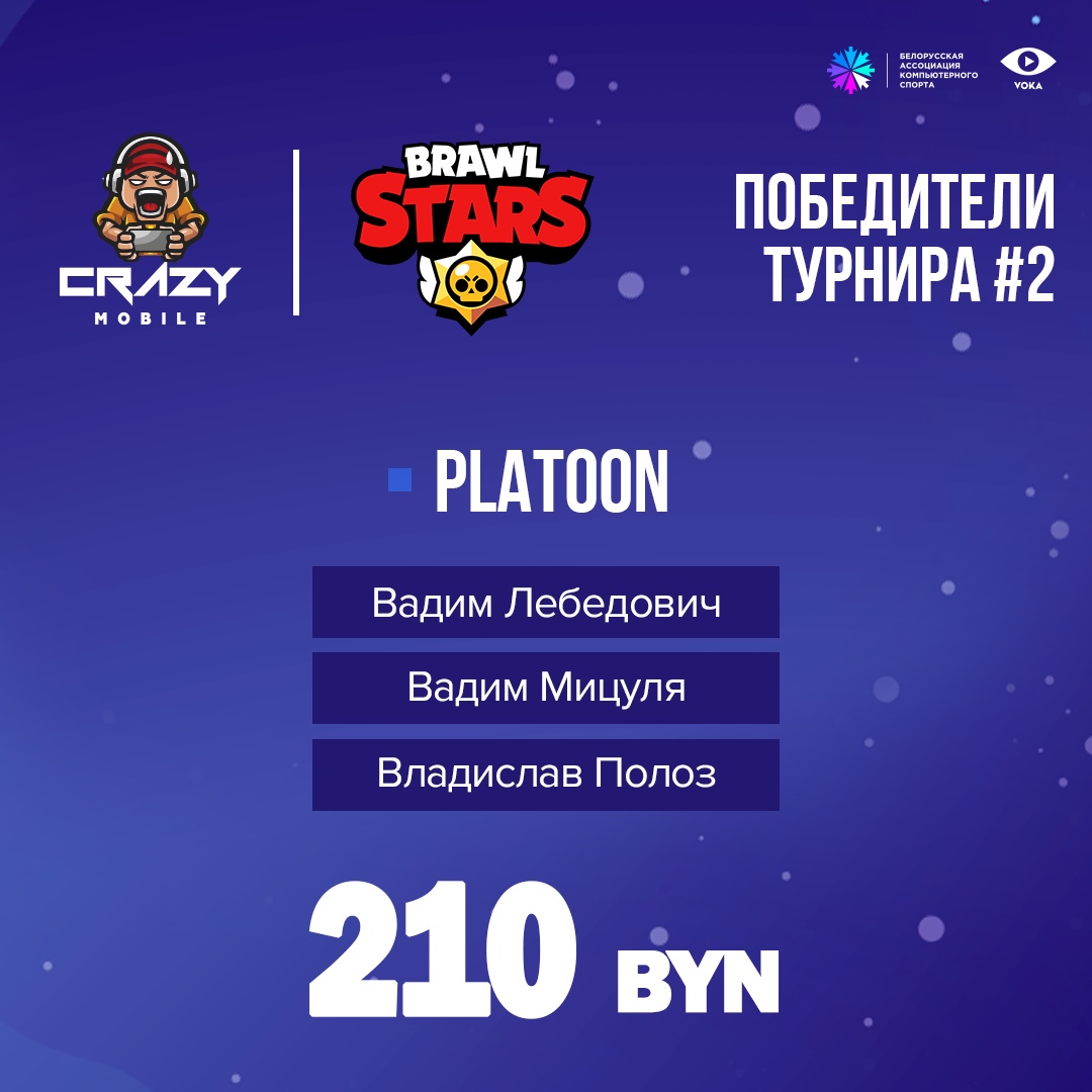 Platoon одержал победу на втором турнире по Brawl Stars в рамках серии мобильных турниров Crazy Mobile от Белорусской ассоциации компьютерного спорта. В финале состязания команда всухую обыграла ELLLLLLLLLLLPrimoooooo — 4:0. За победу в турнире Platoon заработал 210 белорусских рублей.