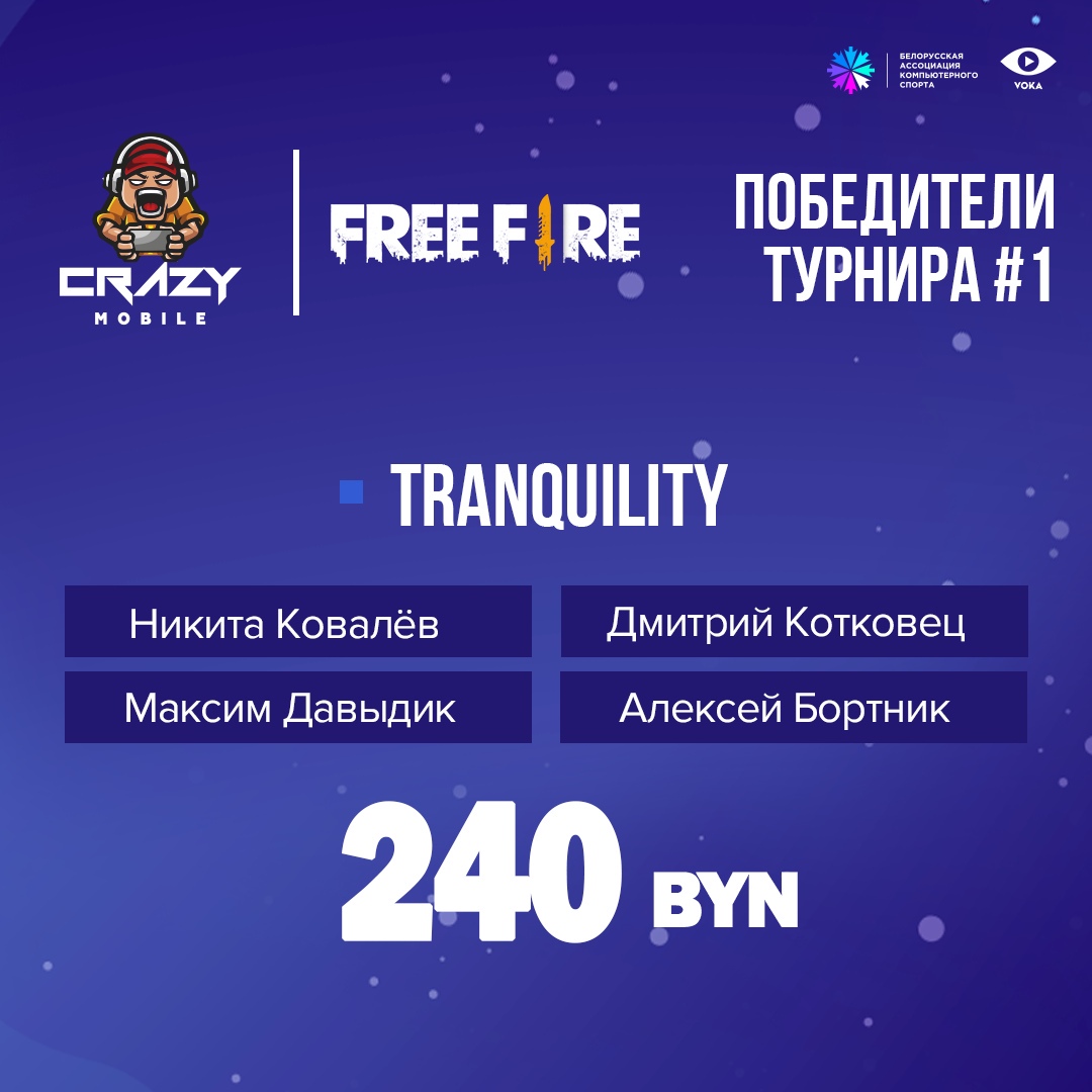 Стали известны победители первого турнира по Garena Free Fire в рамках серии ивентов Crazy Mobile, организованного Белорусской ассоциацией компьютерного спорта. Чемпионский титул завоевал коллектив Tranquility (Никита Ковалев, Дмитрий Котковец, Максим Давыдик и Алексей Бортник). Парни заработали 240 рублей.
