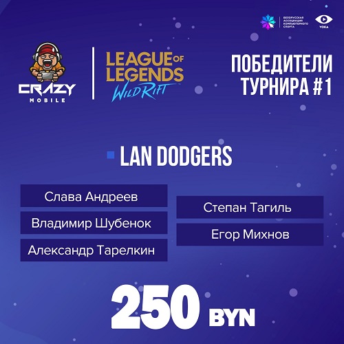 Команда LAN Dodgers стала чемпионом соревнований по League of Legends: Wild Rift в рамках серии мобильных турниров Crazy Mobile от Белорусской ассоциации компьютерного спорта. За победу коллектив получил 250 белорусских рублей.