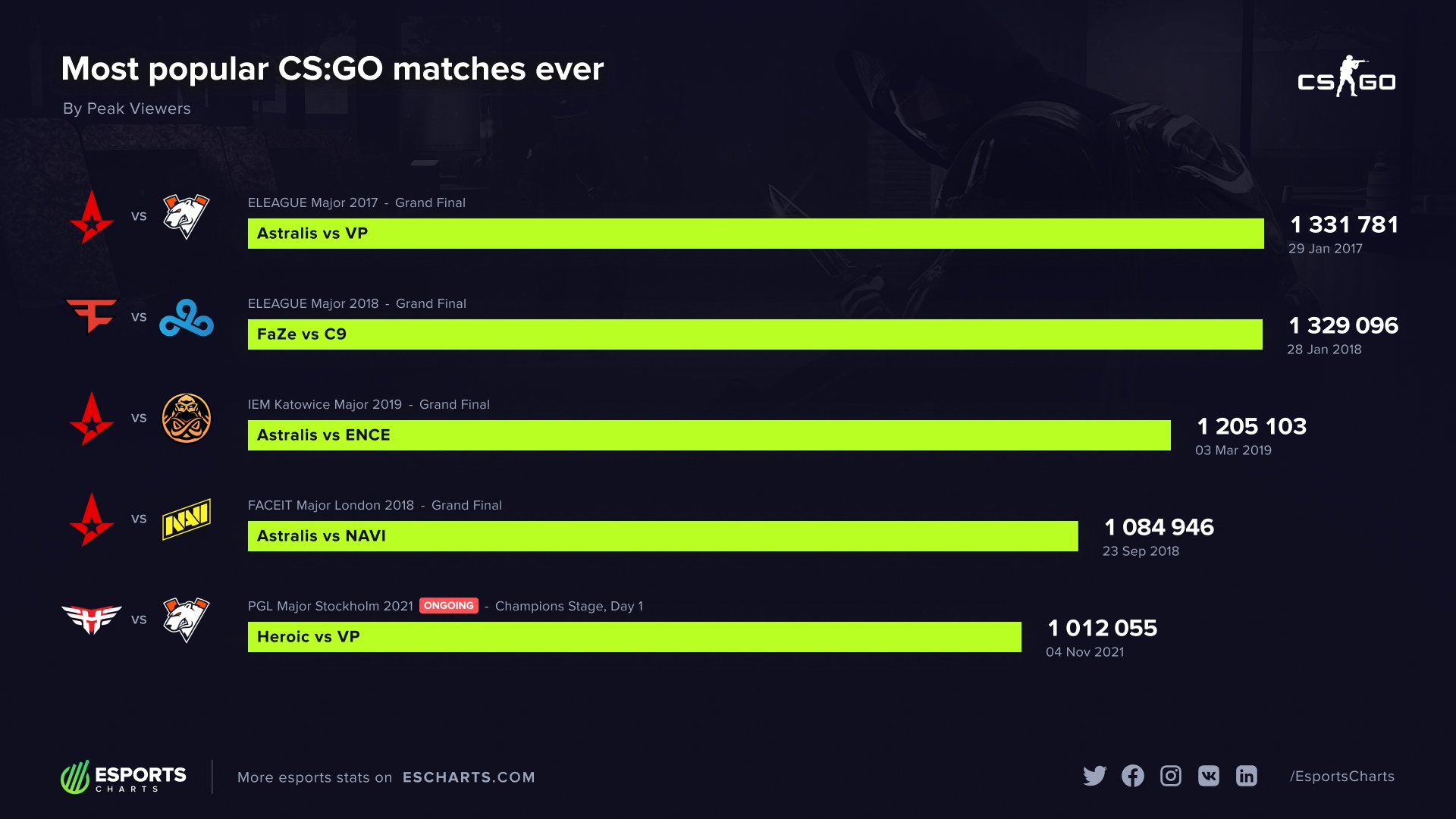 Стало известно общее количество зрителей четвертьфинального матча PGL Major Stockholm 2021 по CS:GO между Virtus.pro и Heroic. Встреча вошла в топ-5 по популярности в истории дисциплины. Такую статистику показал сервис Esports Charts.