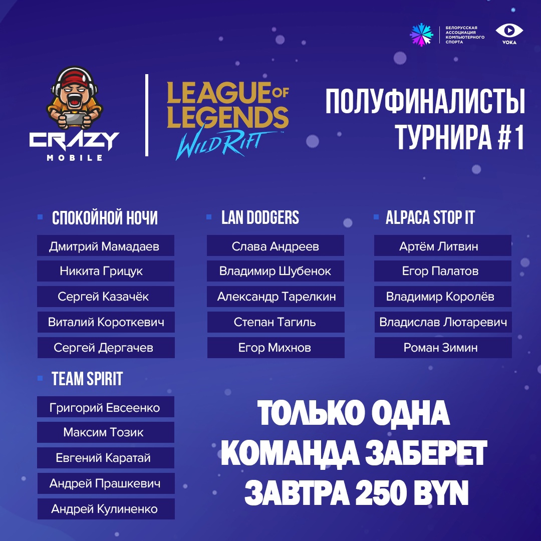 Команды Спокойной ночи, LAN Dodgers, Alpaca stop it и Team Spirit прошли в полуфинал соревнований по League of Legends: Wild Rift в рамках серии мобильных турниров Crazy Mobile от Белорусской ассоциации компьютерного спорта.