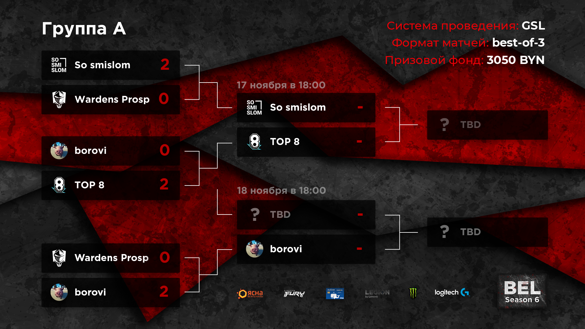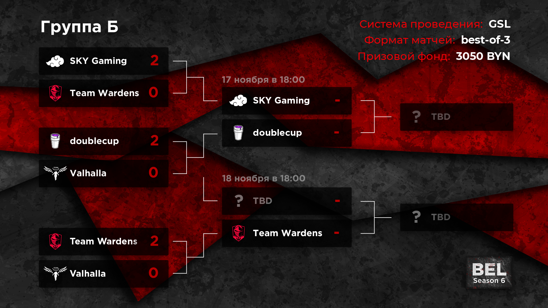Команды Wardens Prospects и Valhalla завершили выступления в рамках шестого сезона Belarusian Esports League по Dota 2. Оба коллективы заняли 7-8 места, проиграв два матча на групповом этапе. Продолжают борьбу за плей-офф после игр 15 ноября borovi и Team Wardens. Следующие матчи этих команд пройдут 18 ноября. Соперники пока не определены.