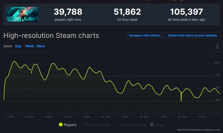В Steam наблюдается отток игроков Battlefield 2042 спустя неделю после релиза.