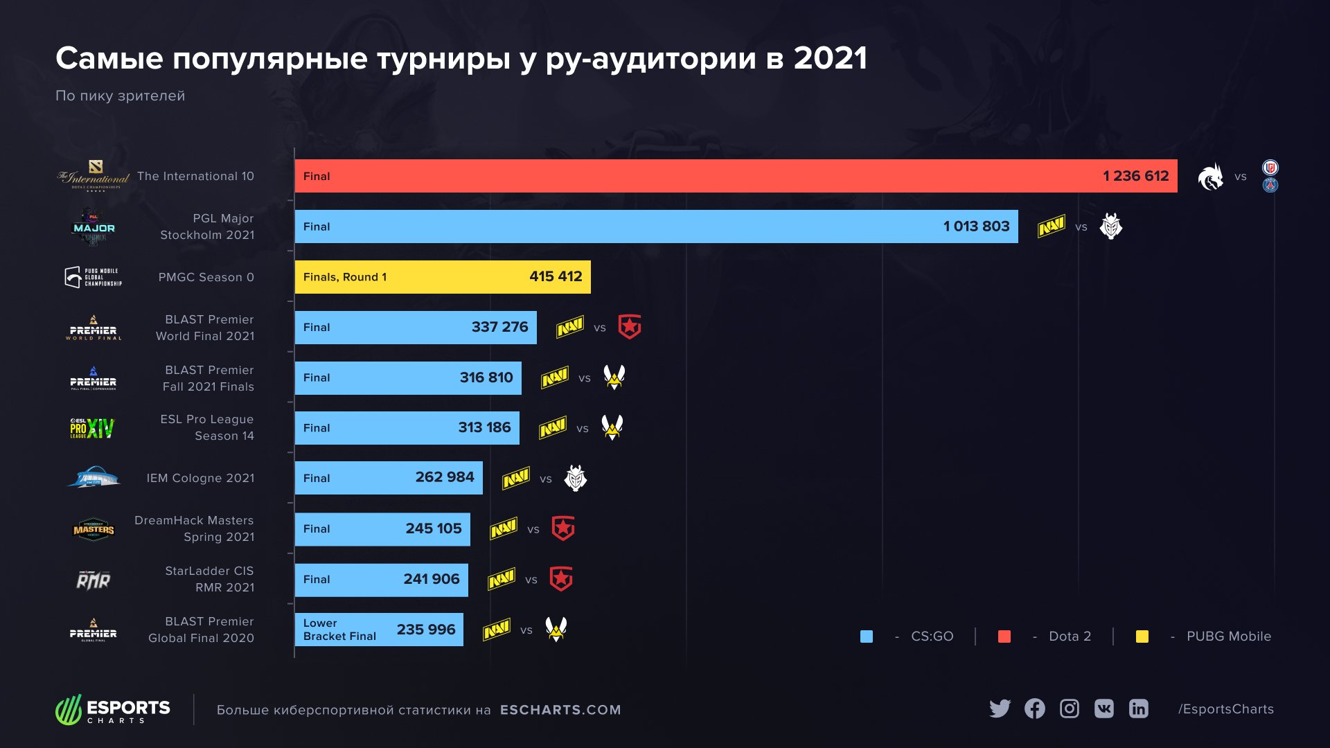Вторым по популярности оказался гранд-финал мейджора по CS:GO PGL Major Stockholm 2021 между Natus Vincere и G2 Esports. В пике за победой украинского клуба на чемпионате мира наблюдало чуть более 1 млн русскоговорящих фанатов. Тройку лидеров замкнул первый раунд финалов PUBG Mobile Global Championship. 4-10 места достались матчам состава NAVI по CS:GO на международных турнирах.