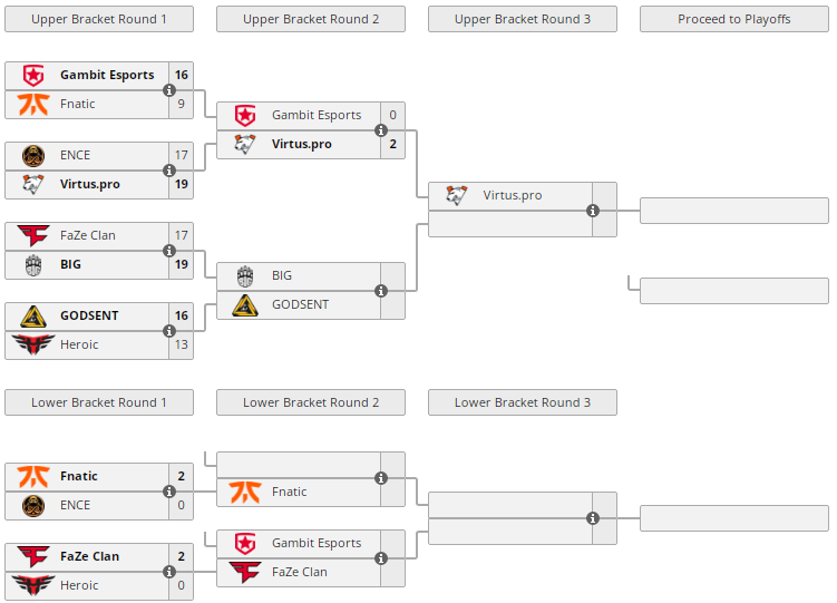 Коллектив Virtus.pro сенсационно выбил Gambit в нижнюю сетку группы “B” на IEM Winter 2021. Финальный счет упорнейшего противостояния — 2:0 (Dust 2 — 19:16, Vertigo — 16:14). Следующий матч “медведи” проведут против победителя пары BIG-GODSENT 4 декабря в 22.00. В свою очередь Gambit поборется за право остаться на турнире с FaZe Clan также 4 декабря, но в 15.30.