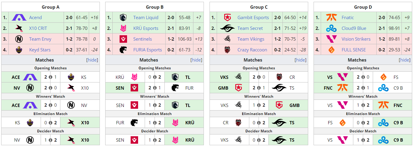 Завершился групповой этап VALORANT Champions 2021. Из каждого квартета в стадию плей-офф вышло по две команды: