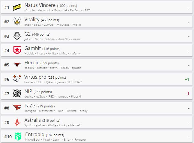 Киберспортивный портал HLTV опубликовал обновленный рейтинг CS:GO команд. Virtus.pro сместила NiP с шестой строчки — это единственное изменение списка коллективов из топ-10.