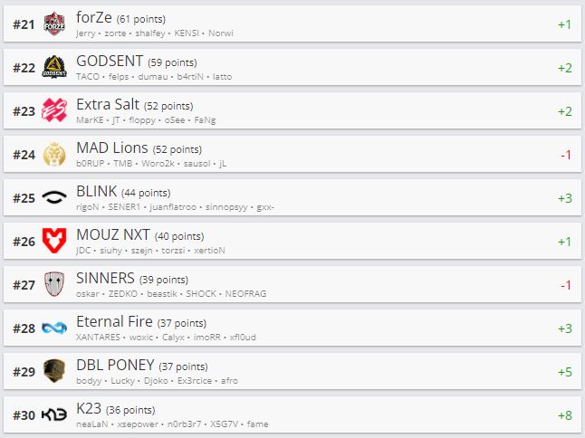 Главный “прорыв” — СНГ-организация K23, вошедшая в топ-30 рейтинга. Отметим, в конце ноября коллектив занимал лишь 38 строчку.