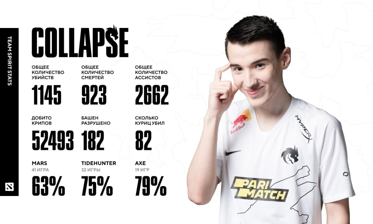 Collapse защищает цвета Team Spirit с декабря 2020 года. Вместе с “драконами” игрок стал триумфатором The International 10.