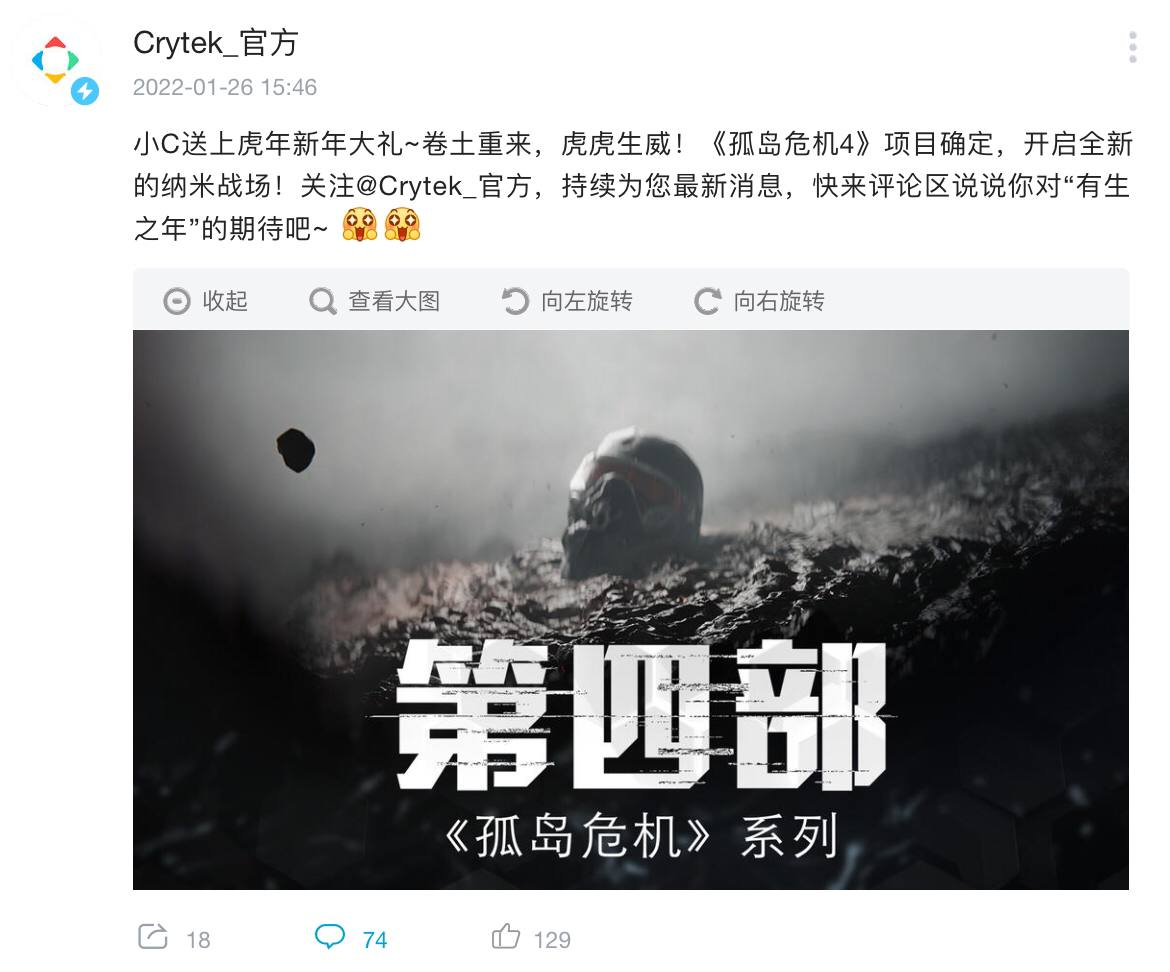 Crysis 4 находится в разработке. Такое объявление появилось от имени аккаунта Crytek в китайской социальной сети BiliBili, сообщает Eurogamer.