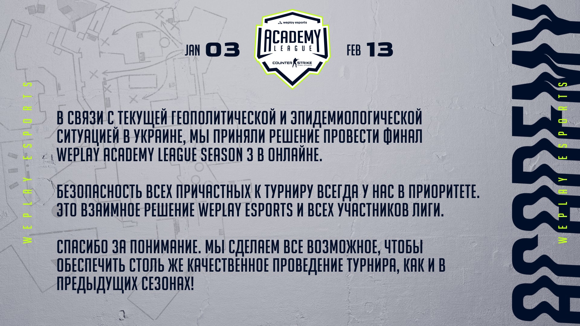 Финальная часть турнира WePlay Academy League Season 3 пройдет в онлайне. Об этом организатор ивента заявил на официальном сайте. Причиной переноса турнира в онлайн стала неприятная эпидемиологическая ситуация в мире.