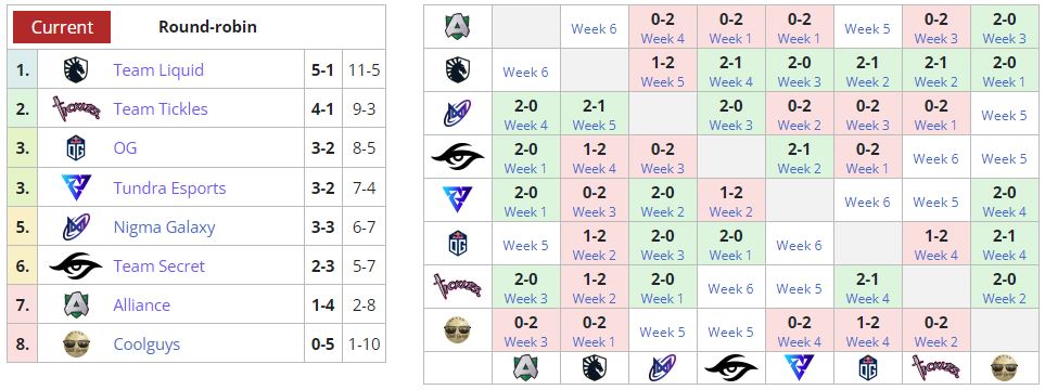 Несмотря на поражение, Liquid все еще занимает первую строчку в таблице. Nigma поднялась на пятое место, одержав три победы кряду.