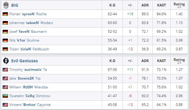 BIG обыграла Evil Geniuses на BLAST Premier: Spring Groups 2022. Встреча завершилась волевой победой немецкого коллектива — 2:1 (Overpass — 8:16, Dust2 — 16:12, Vertigo 16:10).