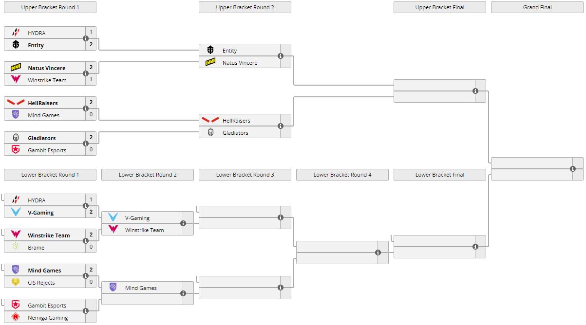 Таким образом, CIS Rejects покинули турнир на 9-12 месте, заработав $500. Mind Games вышла во второй раунд нижней сетки, где сыграет с победителем пары Gambit — Nemiga.