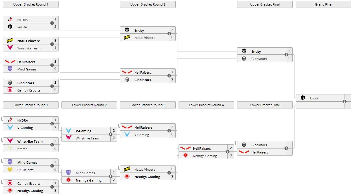 Entity отправилась в гранд-финал турнира. Gladiators упали в нижнюю сетку, где сыграют с HellRaisers за место в топ-2 ивента.