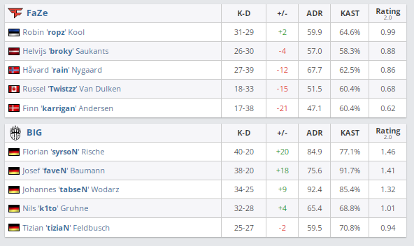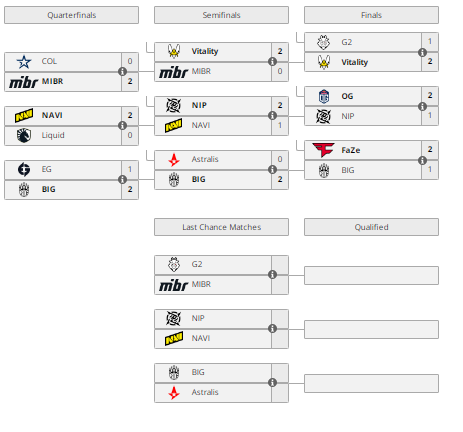 В рамках стадии Play-In на BLAST Premier: Spring Groups 2022 команда FaZe со счетом 2:1 обыграла BIG и завоевала третий слот на BLAST Spring Final 2022. Команды играли на картах Dust2 (9:6; 7:8), Overpass (2:13; 0:3) и Nuke (14:1; 2:0).