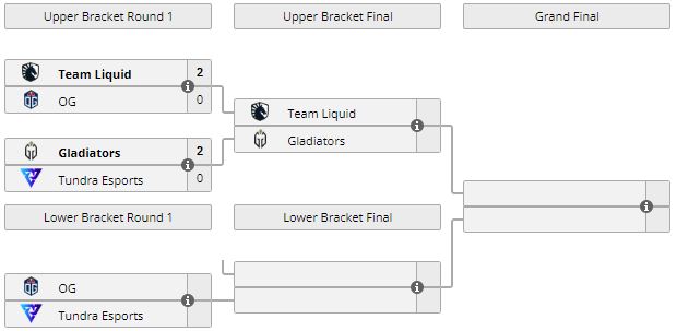 12 февраля Gladiators сыграют с Liquid в матче за выход в гранд-финал ивента. Tundra отправилась в нижнюю сетку, где сразится против OG.